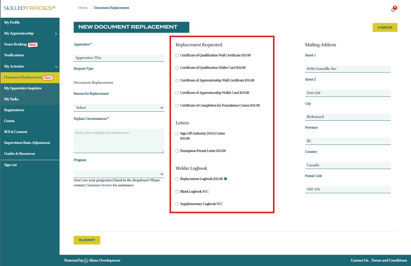 - If the reason for the document replacement is a Name Change, you will need to submit supporting documentation.