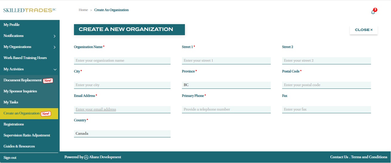 - After logging in, click on “My Activities” from the left navigation menu and click on “Create an Organization”.