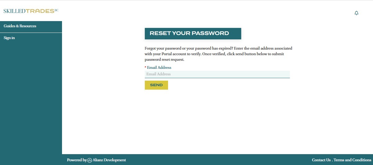 - Enter the email address you used to sign up for a SkilledTradesBC Portal account and click “Send”.